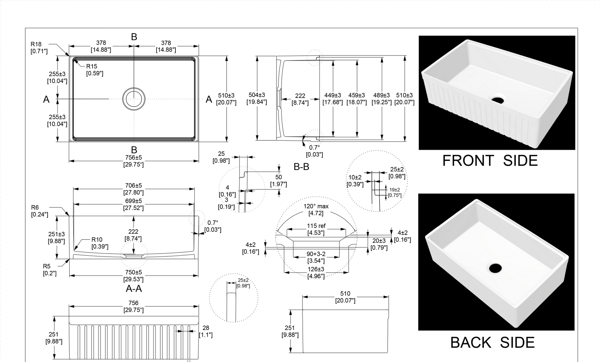 This farmhouse sink is designed for drop-in installation and engineered to fit standard base cabinet dimensions. Clear dimensions and consistent apron geometry help installers achieve a proper fit with minimal on-site adjustment. The sink’s weight, structure, and construction are optimized for custom cabinetry, OEM supply, and multi-unit projects where repeatability and reliability are essential.